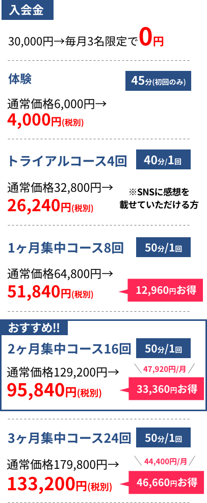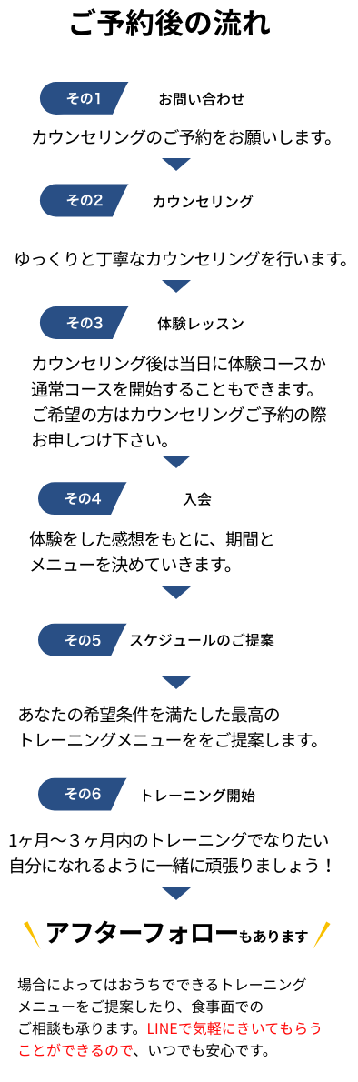 1万人以上の体を変えてきた熟練のトレーナーだからこそ、鋭い感覚と知識で体を分析し、あなたにぴったりのトレーニングを提案します。体はトレーニングの最中にも少しずつ変わっていくので、その変化にも細やかに対応しながらあなたの心身をベストな状態に最速で近づけていくことができます。